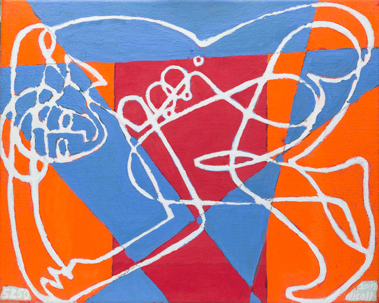Description:Figure lying on red orange and blue background.