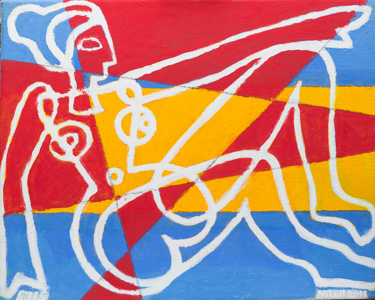 Description:Figure sitting on yellow red and blue background.